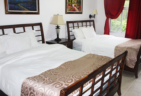 Amplia habitación con dos camas tamaño queen, aire acondicionado, tv por cable y abanico, cuenta con vista a las montañas. Baño con ducha de agua caliente. Ocupación máxima 4 adultos y dos niños. La tarifa le incluye el desayuno continental para los adultos, los niños menores de doce no pagan la estadia más si el consumo.