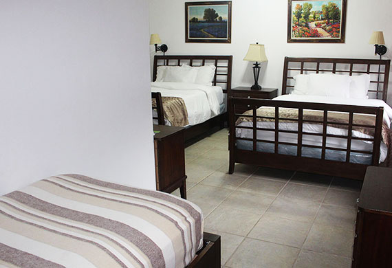 Amplia habitación con dos camas tamaño queen y una cama tres cuartos, aire acondicionado, tv por cable y abanico, cuenta con vista a las montañas. Baño con ducha de agua caliente. Ocupación máxima 5 adultos y dos niños. La tarifa le incluye el desayuno continental para los adultos, los niños menores de doce no pagan la estadía más si el consumo.